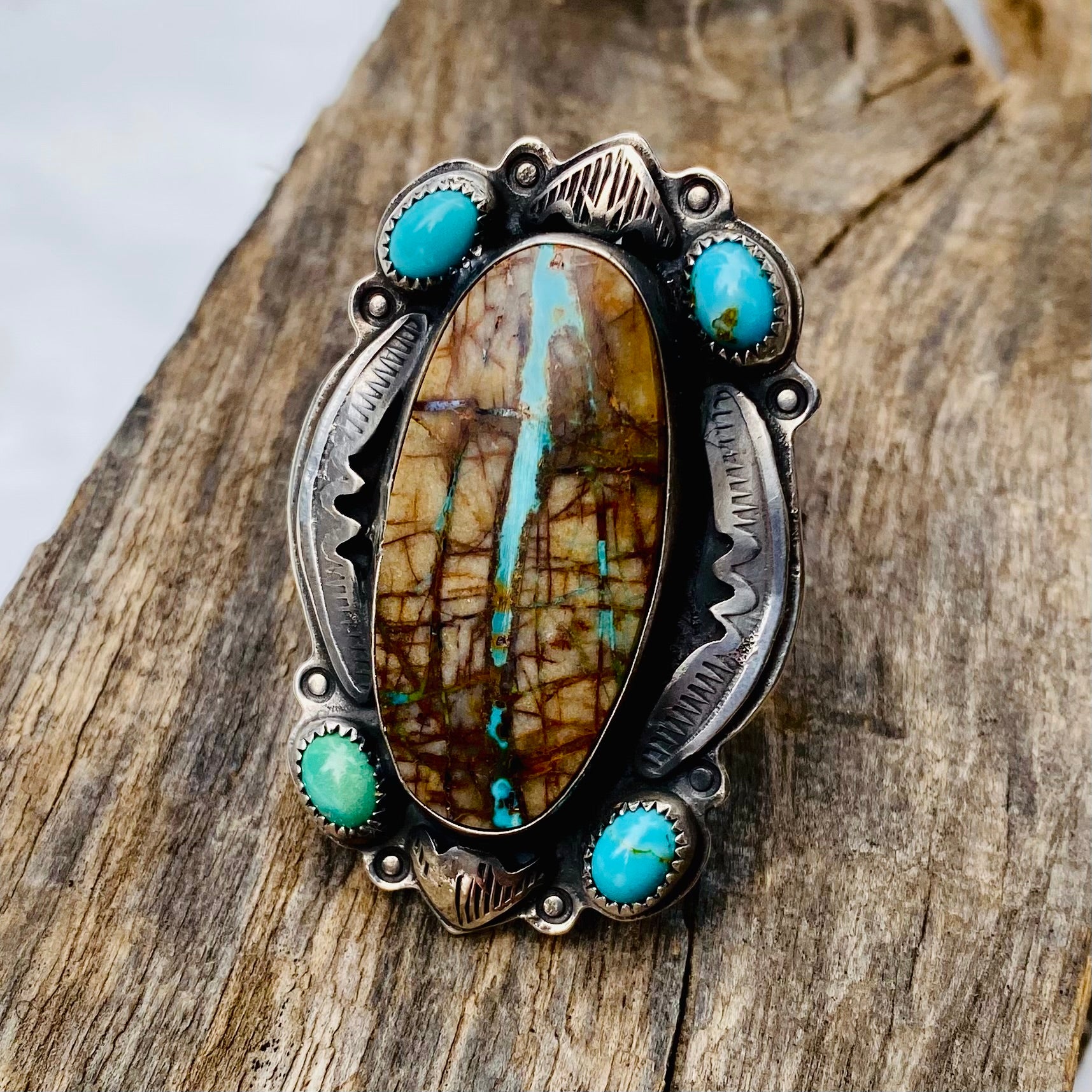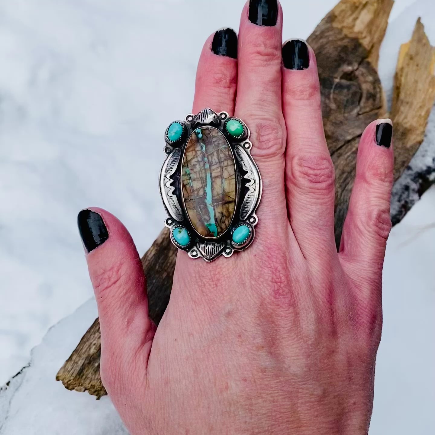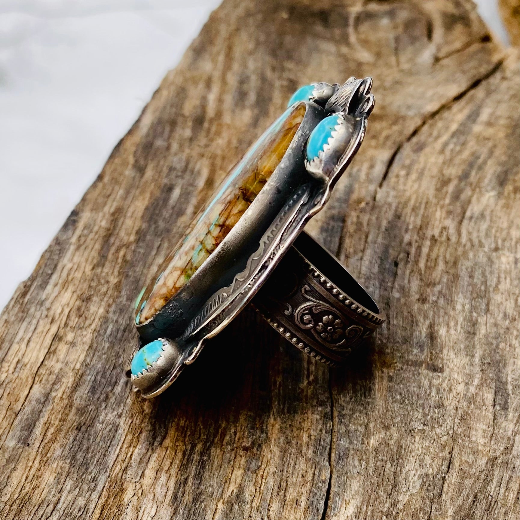 This unique stone is framed in with detailed stamping Repoussé and tiny turquoise stone accents. Ring band features a thick beautiful floral pattern.