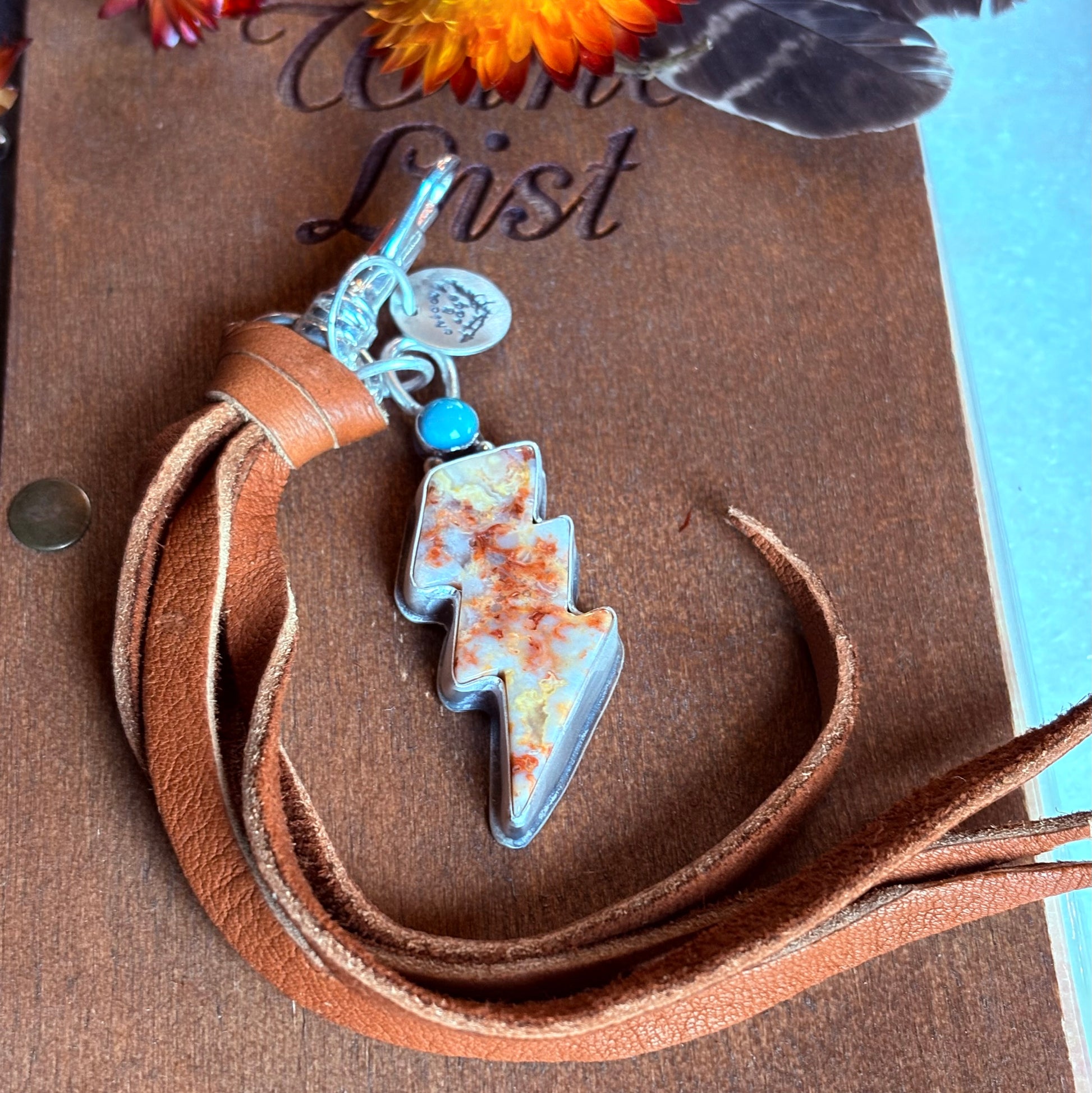 Solid sterling Silver Clasp, Agate Bolt with Turquoise Accent, Set In Handmade Sterling Silver Setting, Deer Hide Fringe.