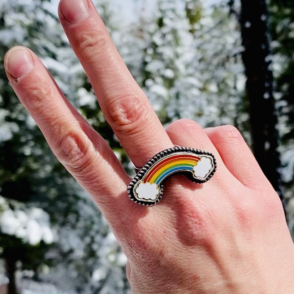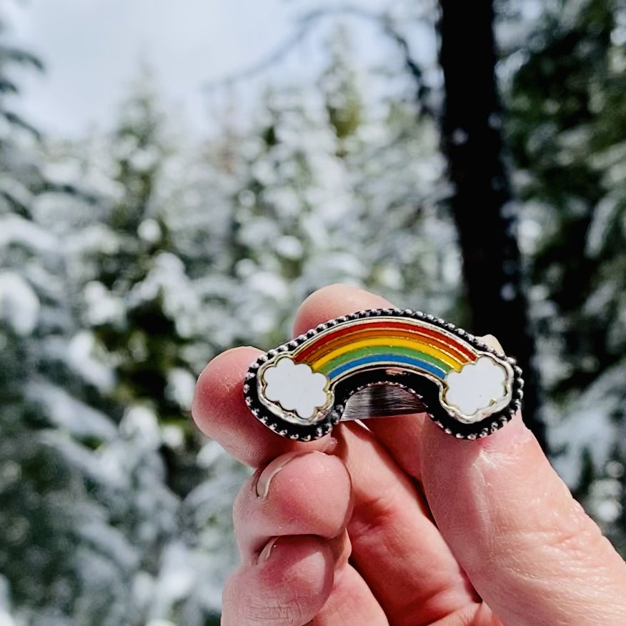 🌈NO RAIN, NO RAINBOW🌈 {available} size 8 wide band. This cutie is made with an upcycled vintage enamel rainbow and set in fine and sterling silver. There’s a secret turquoise stone on the band.